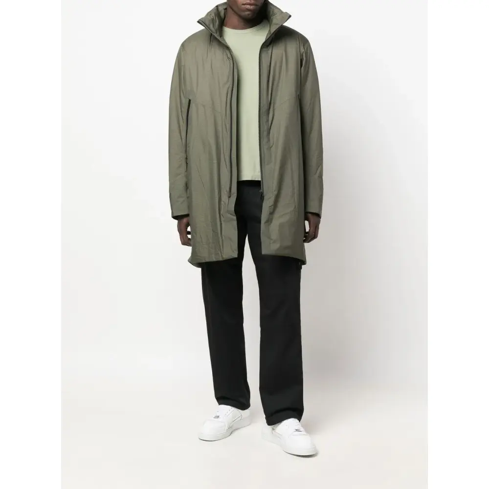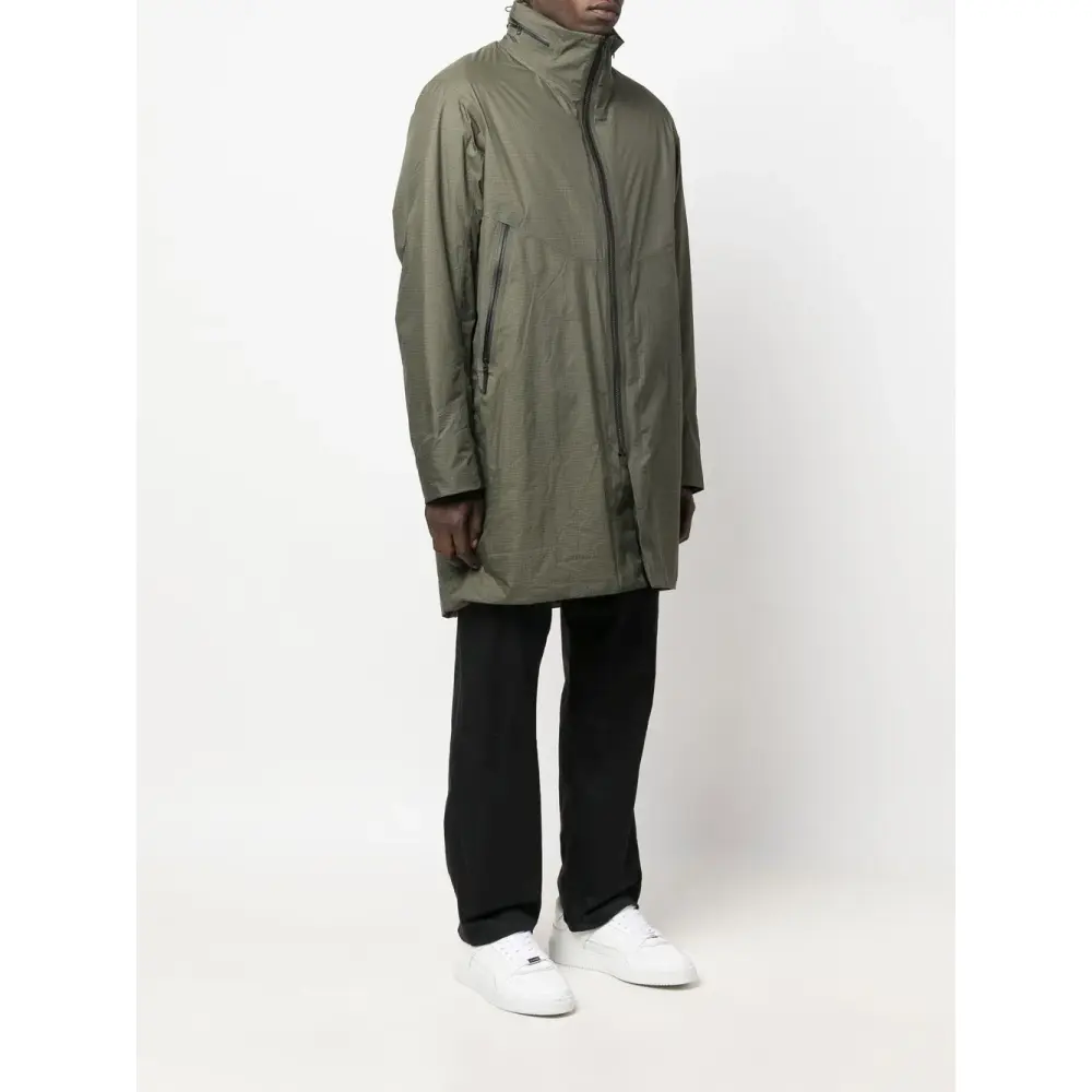 Оливково-зеленый, высокий воротник, застежка на молнии спереди, длинные рукава, два кармана на молнии по бокам и длина выше колена.