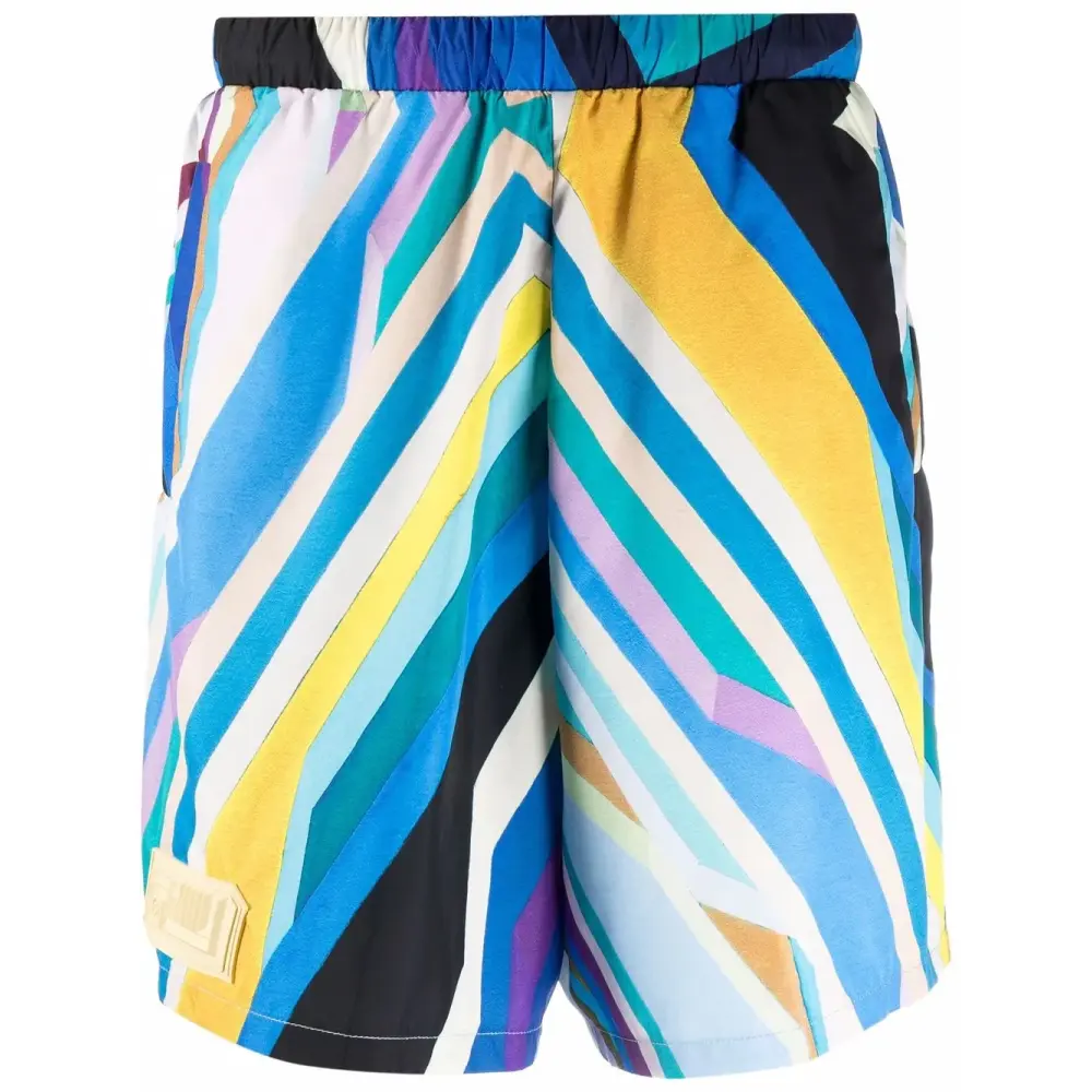 Узор в полоску, завышенная линия талии, эластичный пояс и два кармана по бокам. Цвет: разноцветный.