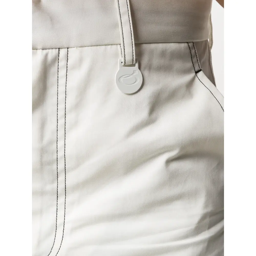 Контрастная строчка, петли для ремня, потайная застежка спереди, два вшитых кармана по бокам и длина по колено.
