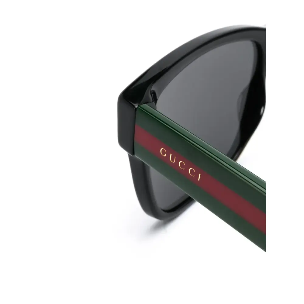Солнцезащитные очки в квадратной оправе с полоской web от Gucci Eyewear. Прямоугольная оправа, затемненные линзы, фирменная зелено-красная полоска Web и золотистый логотип сбоку. Прилагается защитный чехол.