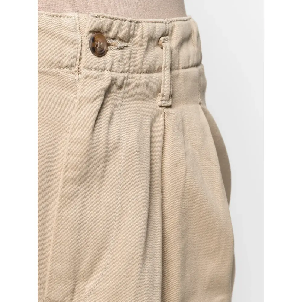 Петли для ремня, потайная застежка спереди, плиссировка, прямой крой и два кармана с листочкой сзади.