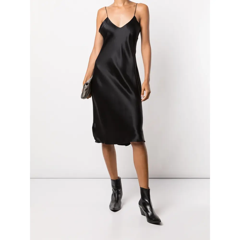 Глубокий V-образный вырез, тонкие бретели, силуэт трапеция и закругленный подол. Цвет: черный.