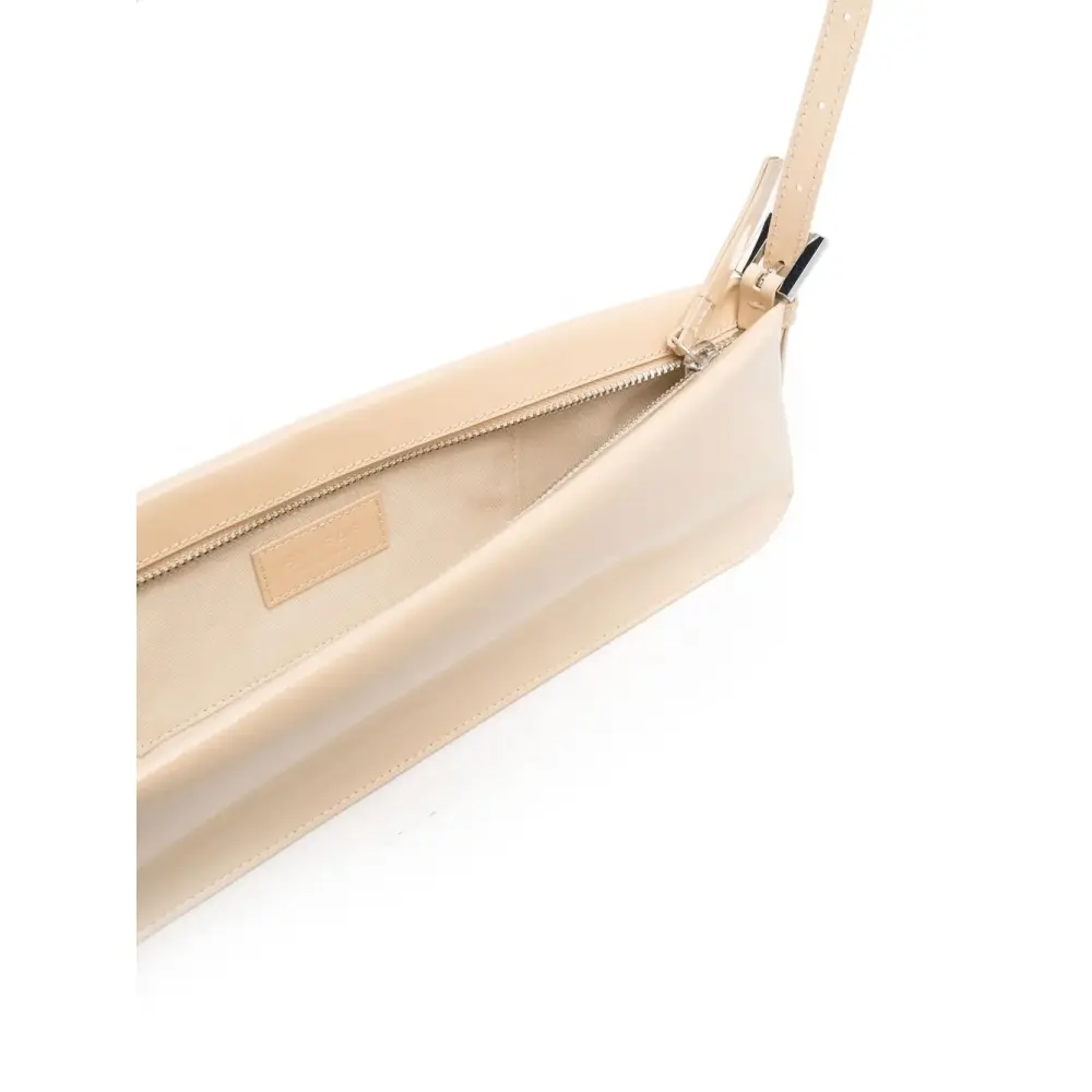 Светло-бежевый, телячья кожа, серебристая фурнитура, выгравированный логотип, нашивка с логотипом внутри, регулируемый ремень на плечо, застежка на молнии сверху и основное отделение.