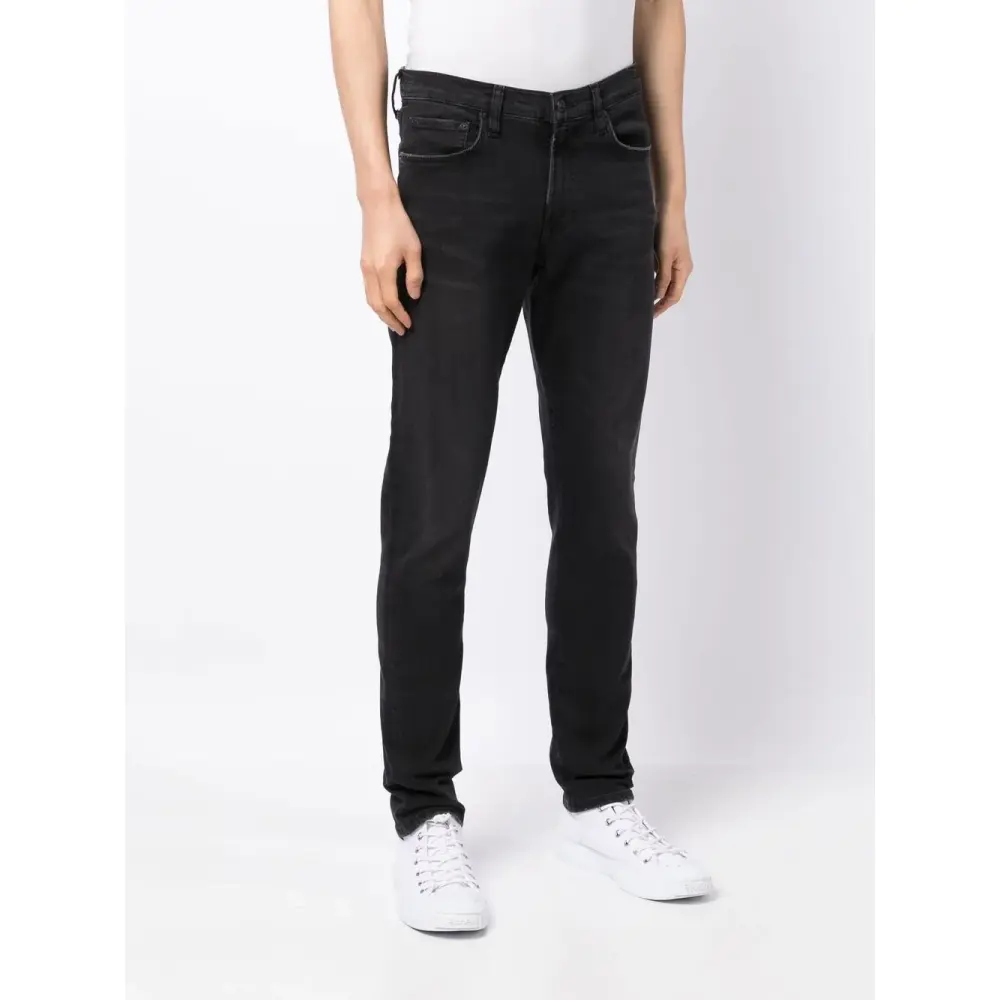 Черный, смесовый хлопок, средняя посадка, зауженный крой, застежка на молнии и пуговице спереди, петли для ремня и пять карманов.