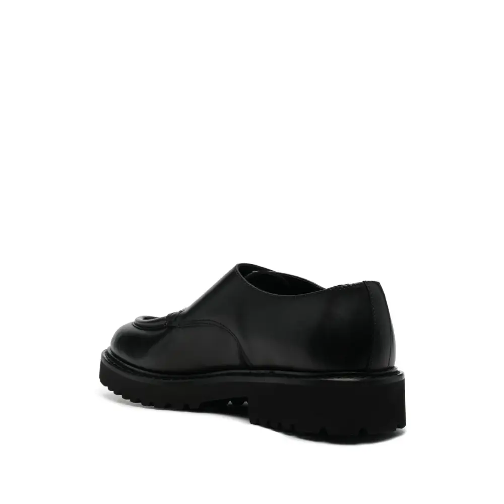 Черный, телячья кожа, застежка с двумя пряжками, миндалевидный носок, кожаная стелька с логотипом, плоская резиновая подошва и низкий блочный каблук.