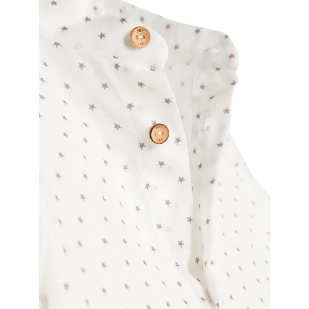 Белый, расцветка Plum Purple, хлопок, принт с изображением звезд, воротник-стойка, застежка на пуговицах спереди, длинные рукава, манжеты на пуговицах и прямой подол.