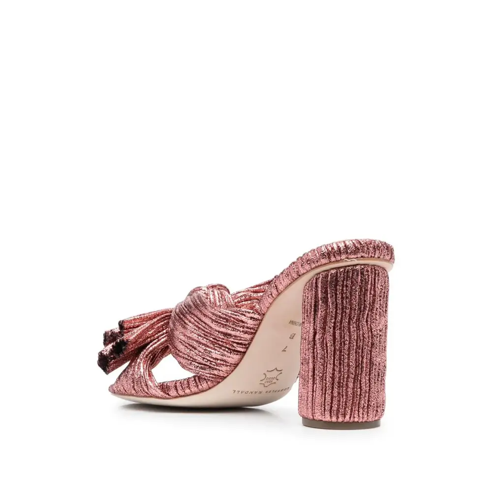 Розовый, телячья кожа, люрекс, бант, открытый носок, стелька с логотипом и высокий блочный каблук. . Узнать больше о том, какие товары получают отметку «Ответственный выбор», можно из материала «Как мы оцениваем экологичность и этичность».