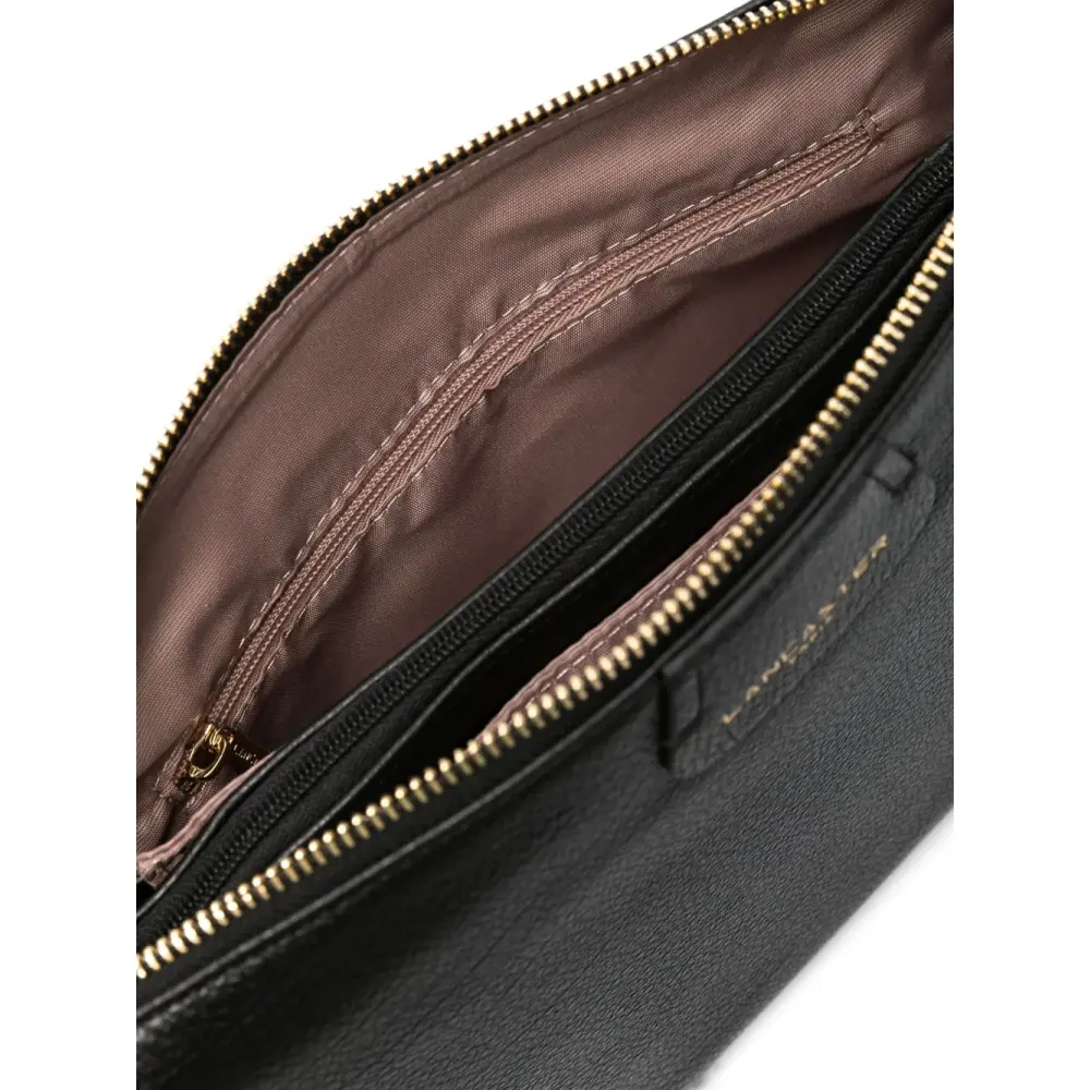 Черный, телячья кожа, зернистая текстура, строчка в тон, золотистая фурнитура, тисненый логотип спереди, застежка на молнии сверху, съемная верхняя ручка, съемный ремень на плечо, основное отделение и внутренний карман на молнии.