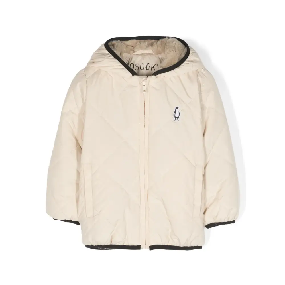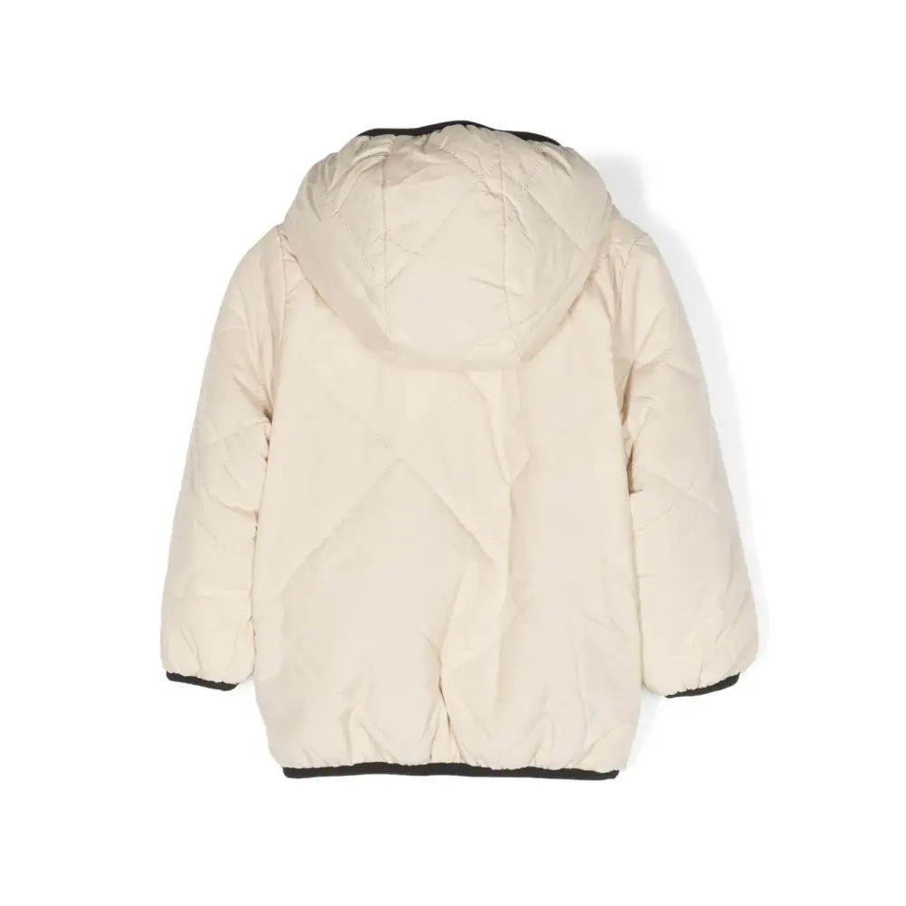 Песочно-бежевый, дутый материал, стеганый материал, нашивка с логотипом на груди, контрастная отделка, классический капюшон, застежка на молнии спереди, длинные рукава, прямой подол и подкладка из искусственного меха.