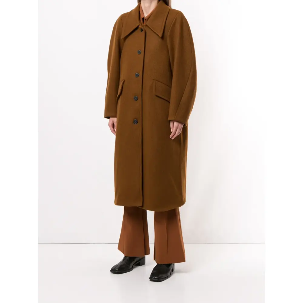 Длинные рукава, застежка на пуговицах спереди и удлиненный воротник. Цвет: коричневый.