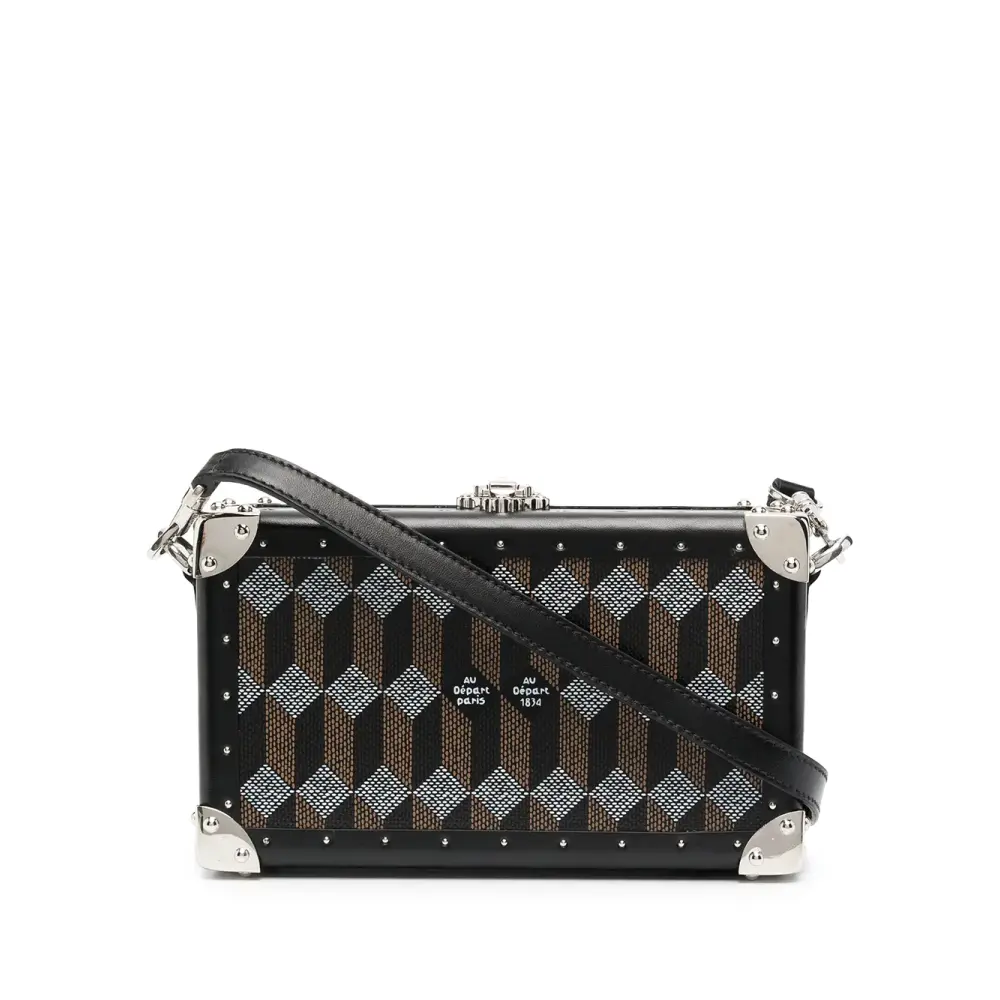 Монограмма, серебристая фурнитура, съемный ремень на плечо, застежка на защелку, основное отделение и внутренний прорезной карман. Цвет: черный.