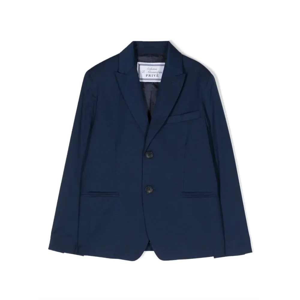 Темно-синий, заостренные лацканы, длинные рукава, манжеты на пуговицах, застежка на пуговицы, прорезной карман на груди и два прорезных кармана спереди.