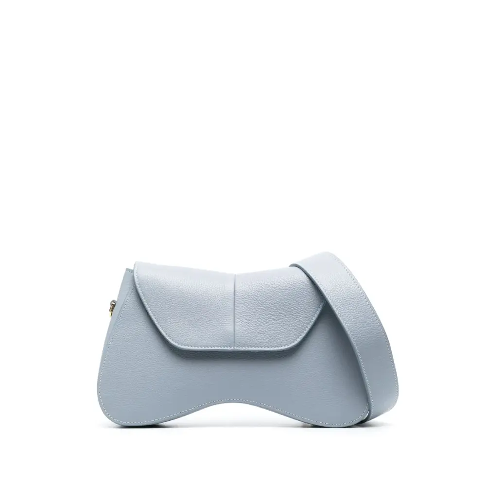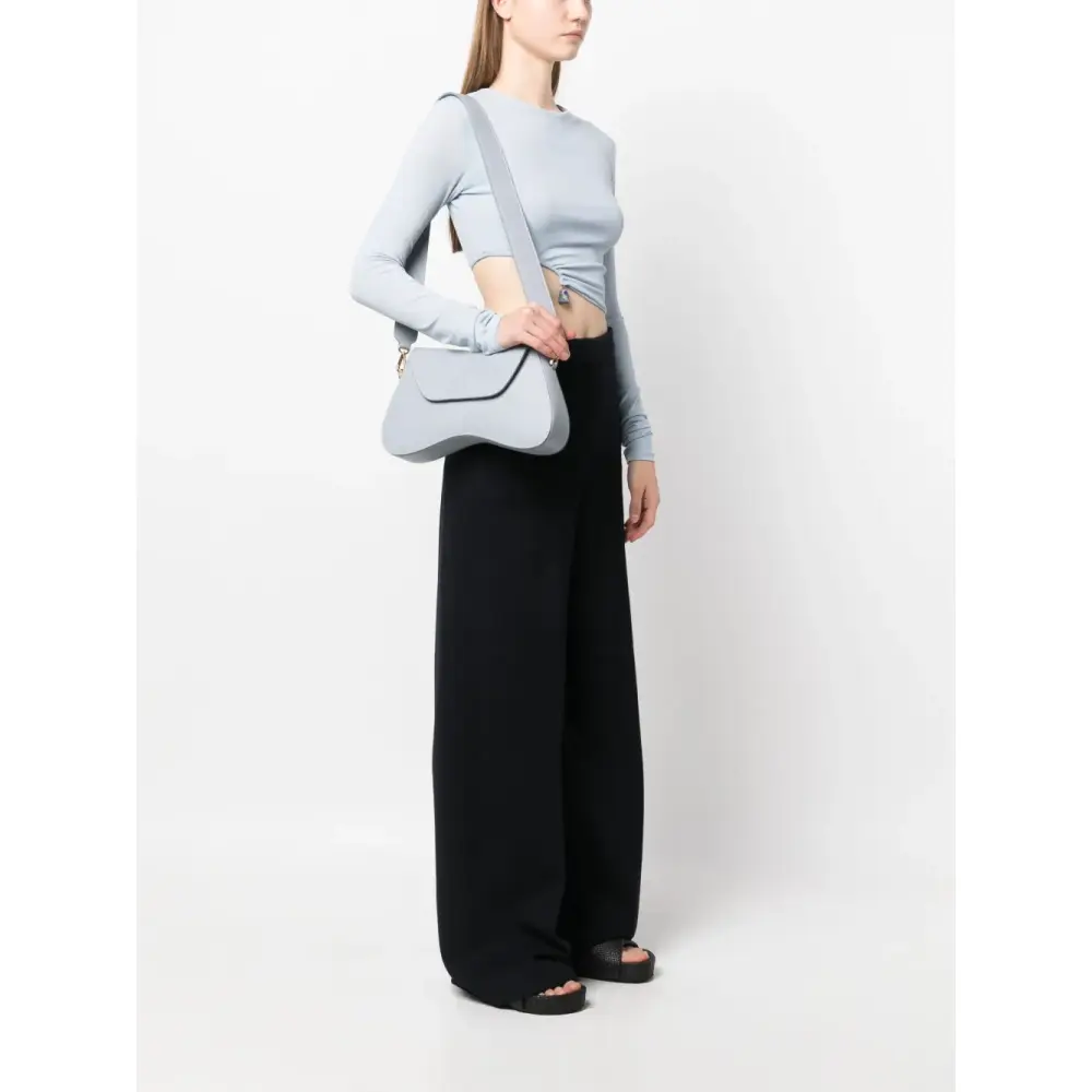 Сине-серый, кожа, зернистая текстура, строчка в тон, съемный регулируемый ремень на плечо, откидной клапан на магните, основное отделение и нашивка с логотипом внутри.