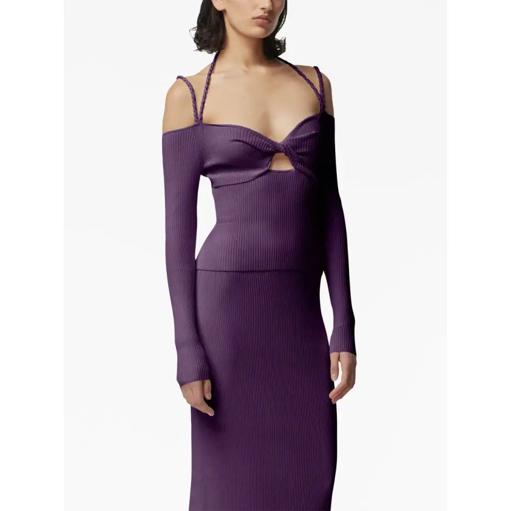 Аметистовый, трикотаж в рубчик, бралетт, вырезные детали, вырез-петля халтер, вырез в форме сердца, квадратный вырез на спине, тонкие бретели, рукава с открытыми плечами, длинные рукава и прямой подол.
