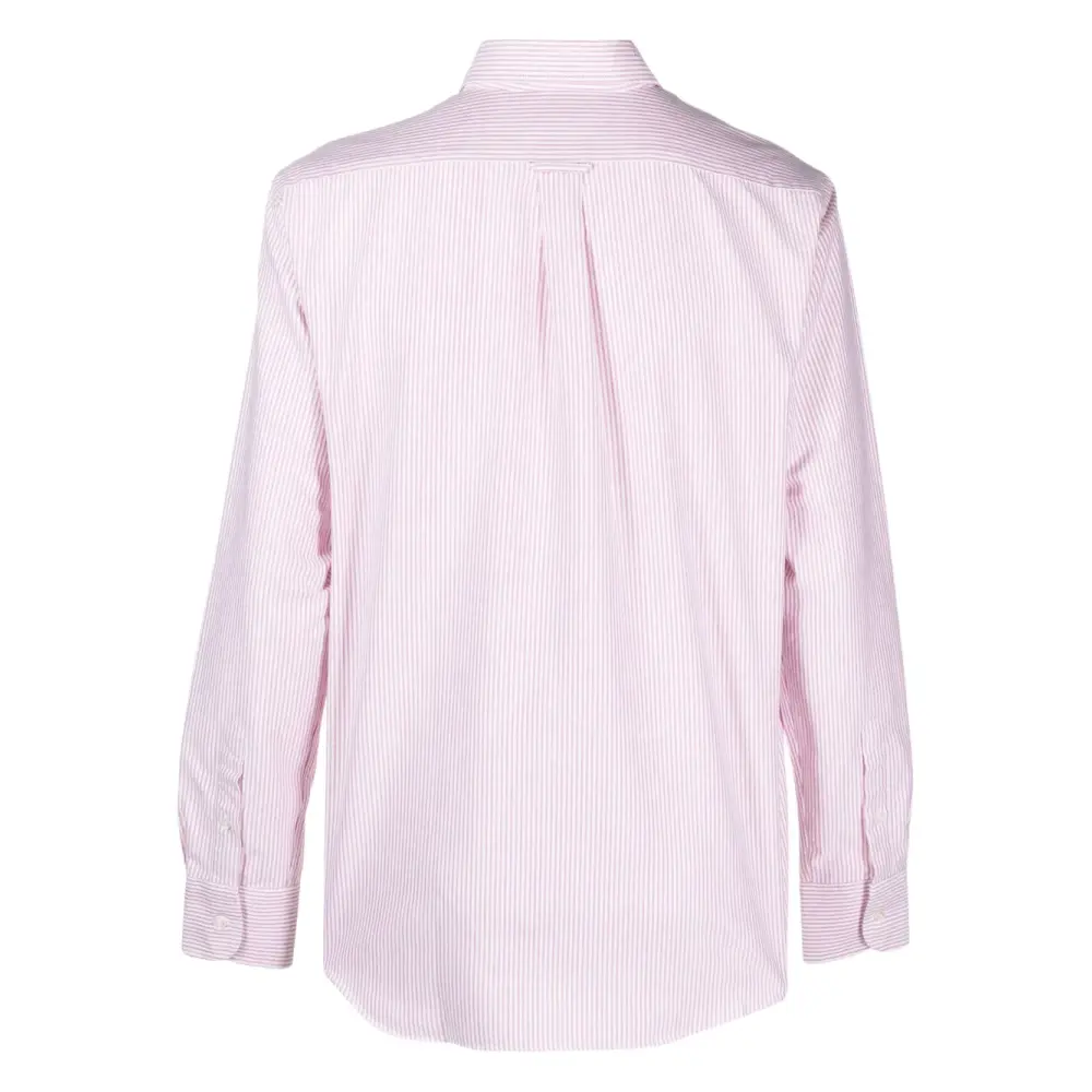 Белый, хлопок, узор в тонкую полоску, отложной воротник, застежка на пуговицах спереди, нагрудный накладной карман, длинные рукава, манжеты на пуговицах и прямой подол.