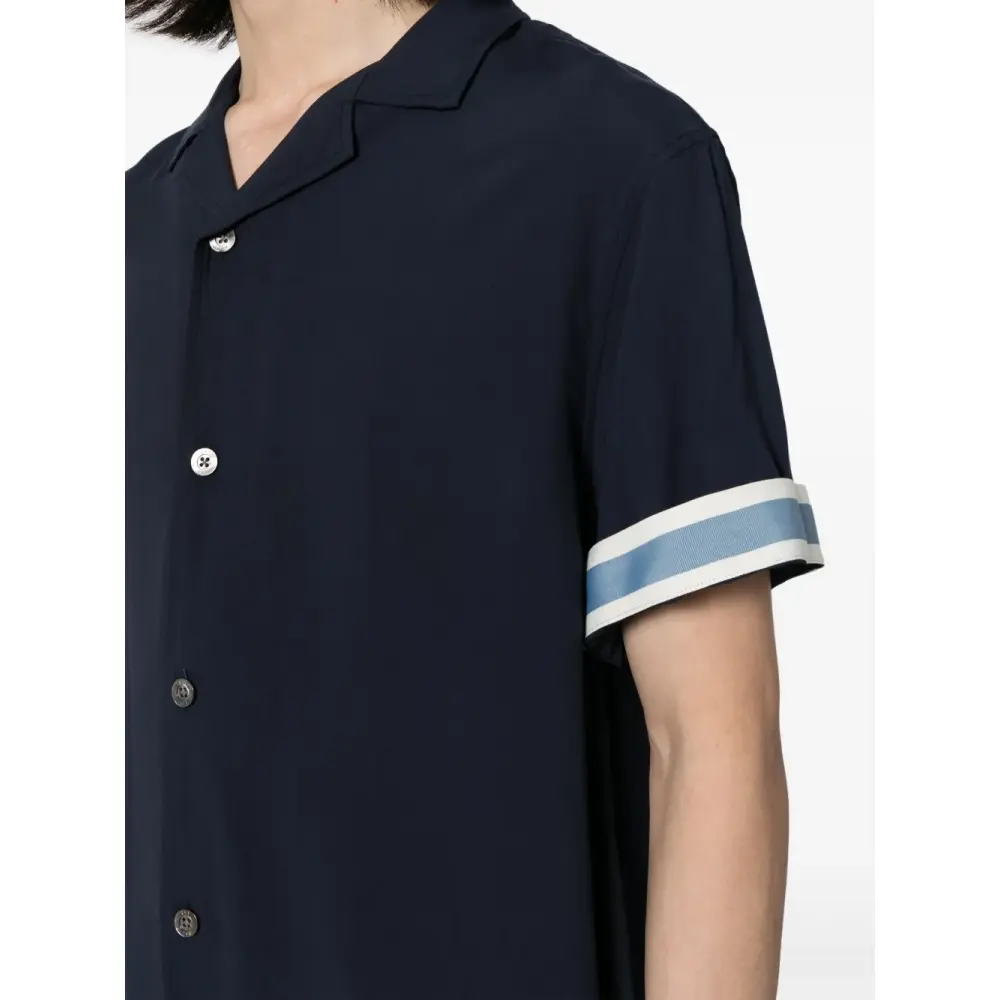 Строчка в тон, полоски, кубинский воротник, застежка на пуговицах спереди, короткие рукава и прямой подол.