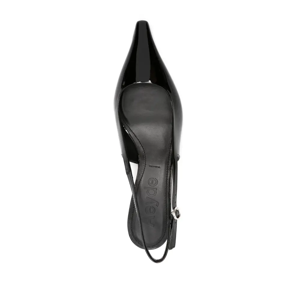 Черный, телячья кожа, лакированная отделка, заостренный носок, ремешок на пятке с пряжкой, логотип на стельке и каблук-шпилька.
