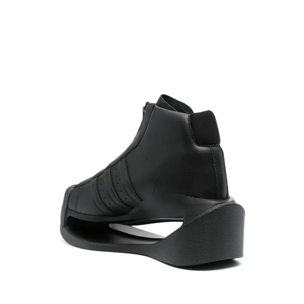 Черный, телячья кожа, гладкая текстура кожи, вырезные детали, знаковый логотип 3-Stripes, закругленный носок, застежка на молнии спереди, промежуточная подошва из этиленвинилацетата (EVA) и плоская платформа.