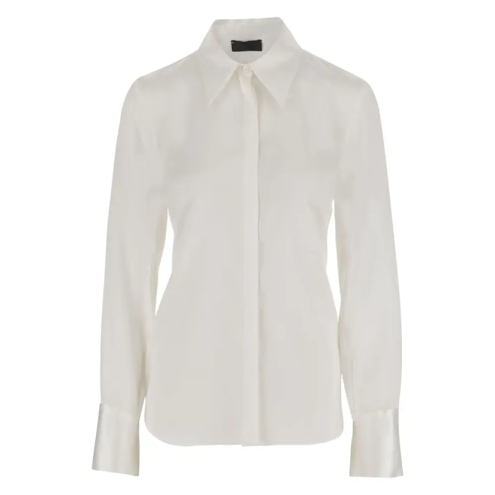 Рубашка из эластичного шелка Заострённый воротник Длинные рукава Манжеты на пуговицах Скрытая застёжка на пуговицах спереди Приталенный крой Закруглённый подол Белый цвет Сделано в Италии Состав: 97% шелк, 3% эластан