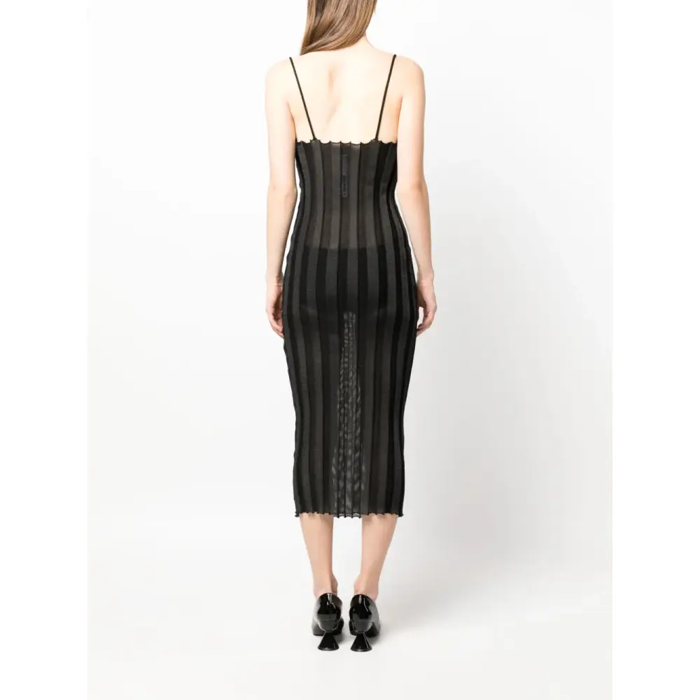 Черный, ткань в мелкий рубчик, квадратный вырез, тонкие бретели и длина миди.