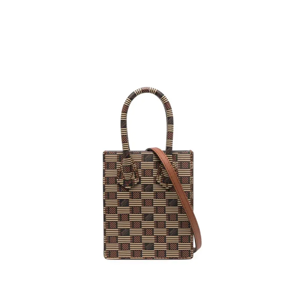 Расцветка Tobacco Brown, телячья кожа, сплошной графичный принт, две плоские верхние ручки, съемный ремень на плечо и основное отделение.