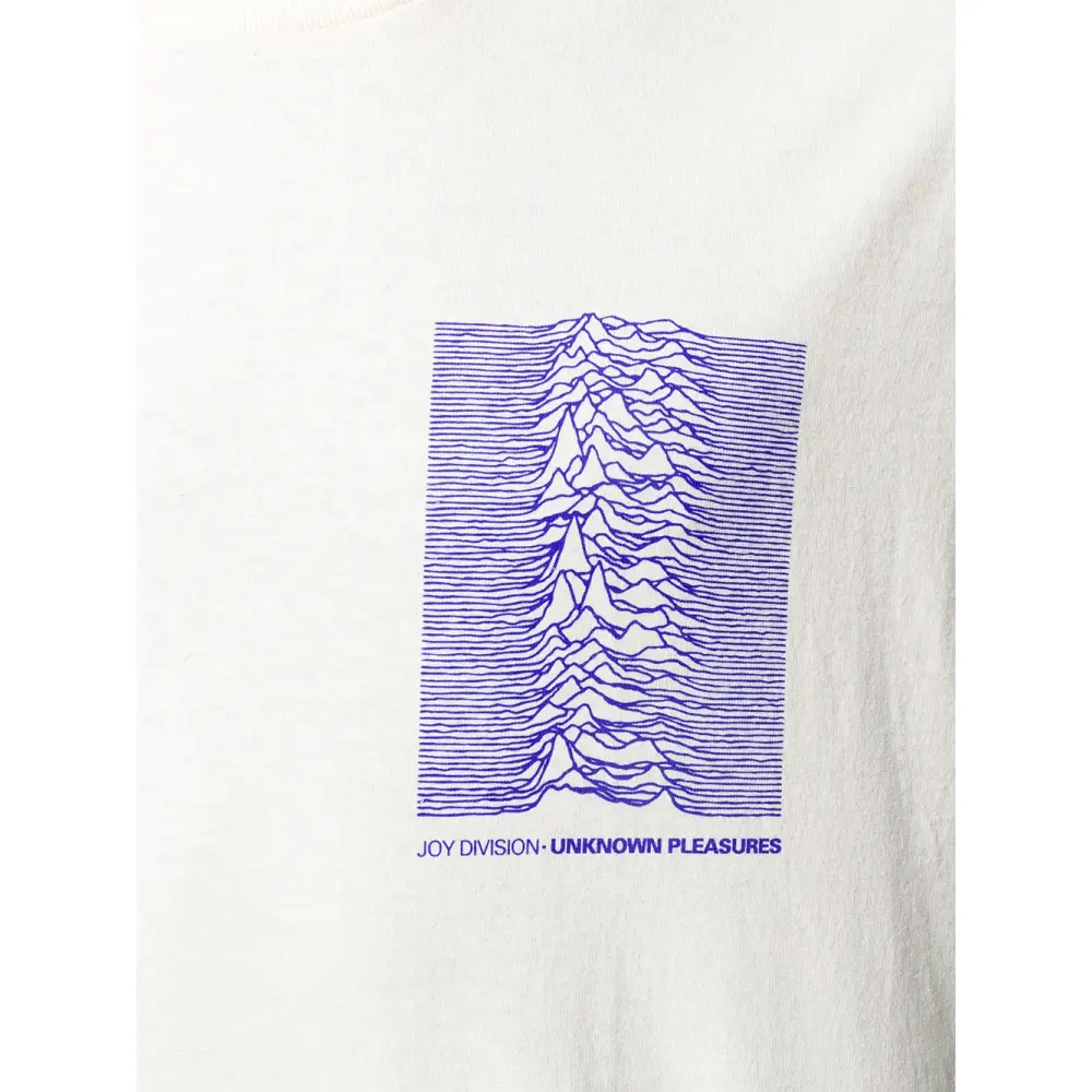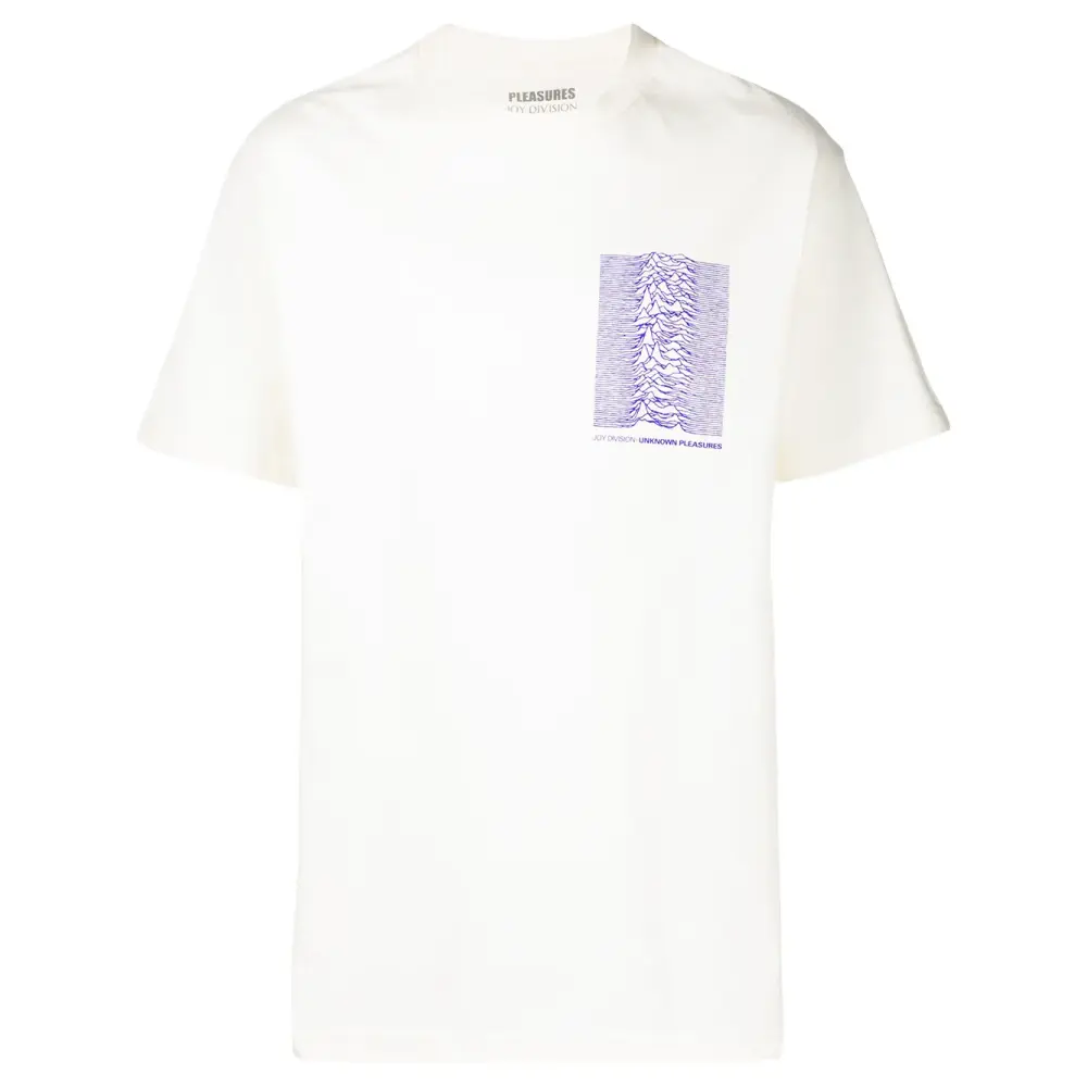 Футболка из коллаборации с Joy Divison Up от Pleasures. Круглая горловина в рубчик, короткие рукава, прямой подол и дизайн в двух тонах.