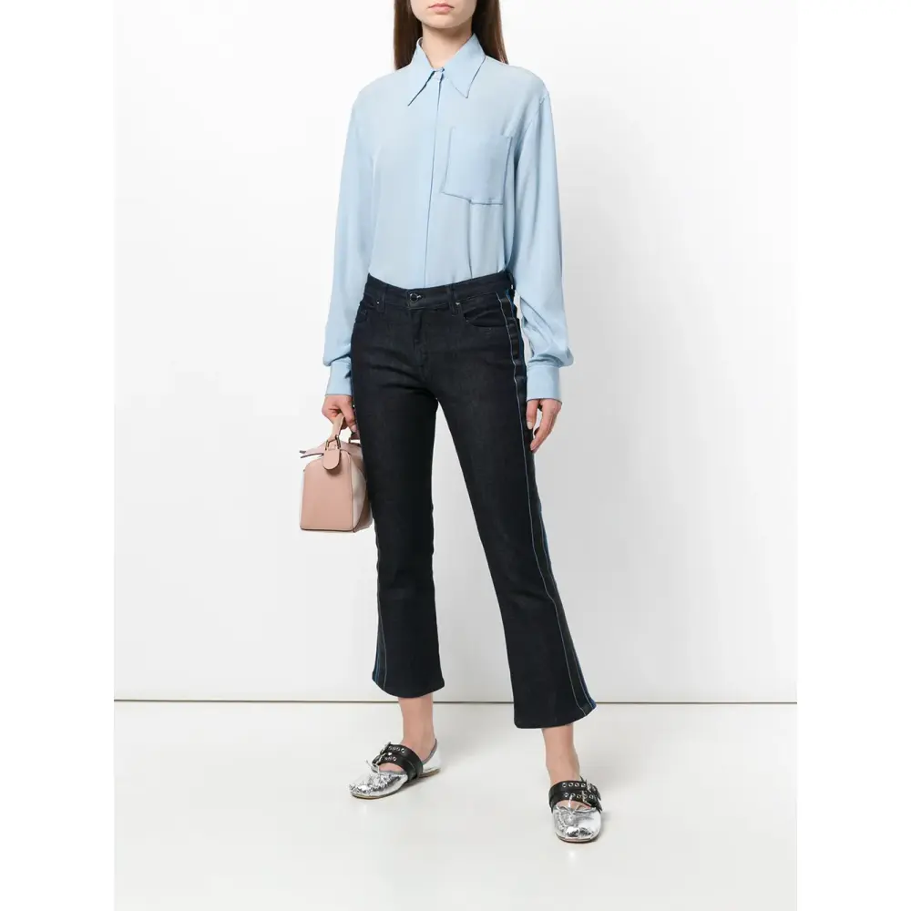 Темно-синие укороченные расклешенные джинсы из эластичного хлопкового микса от Victoria Victoria Beckham. Низкая посадка, пояс со шлевками, застежка на пуговицу и молнию, расклешенные штанины, лампасы, укороченная длина.