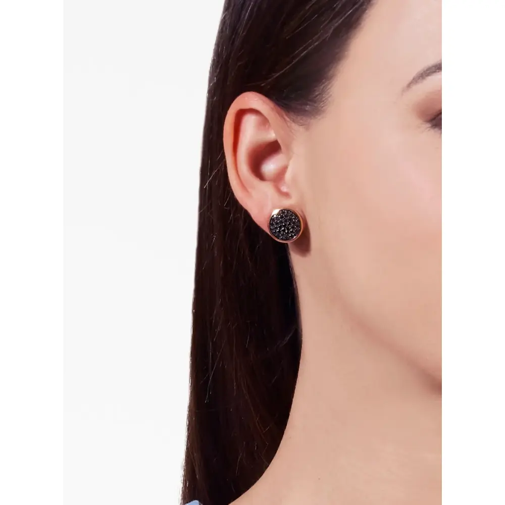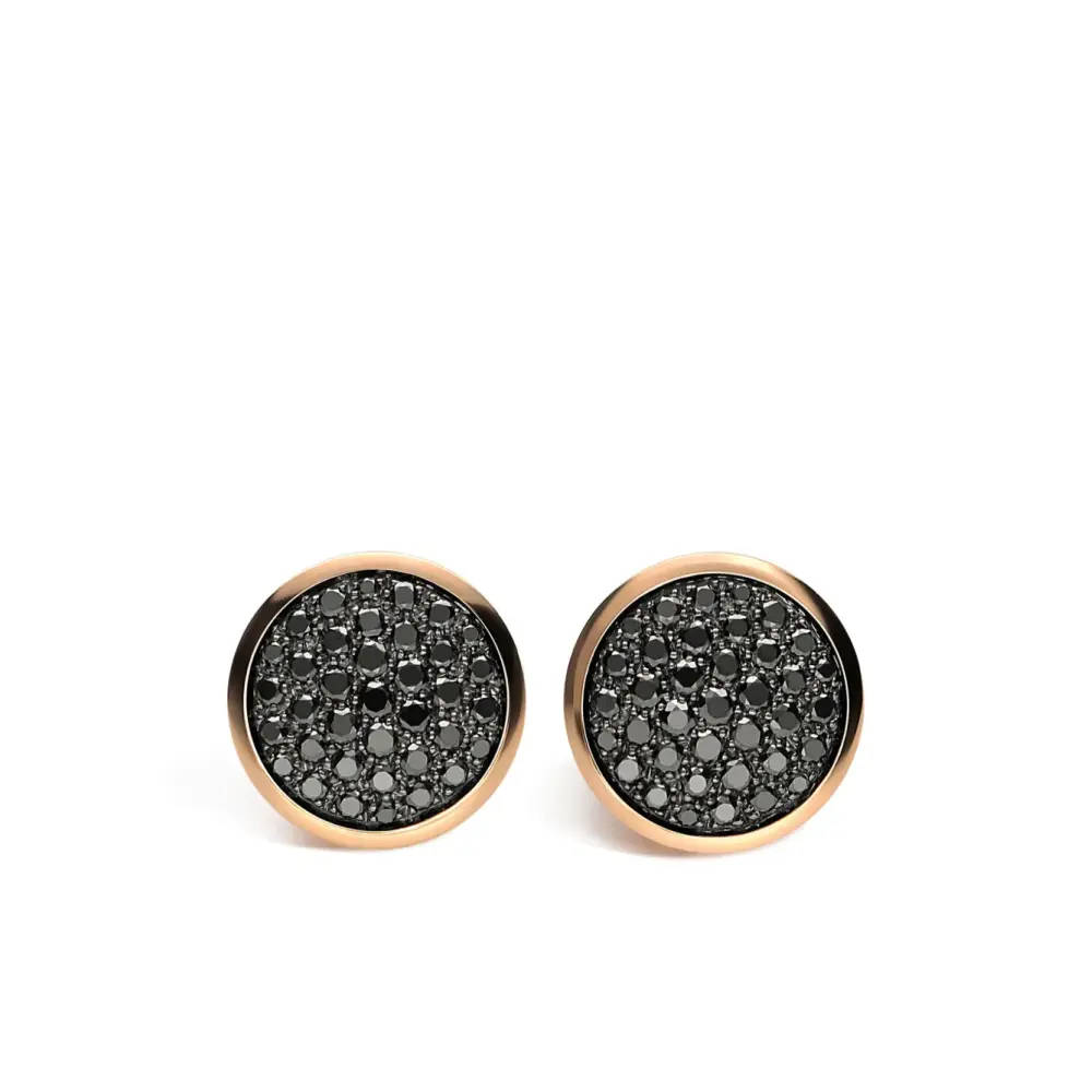 18-каратное желтое золото, глянцевая фактура, черные бриллианты, закрепка паве и для проколотых ушей. В комплект входят две серьги.