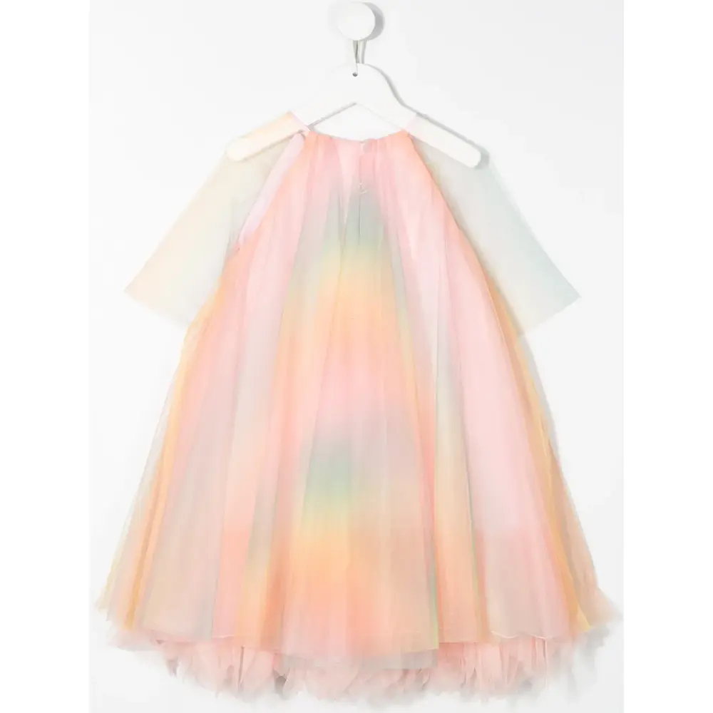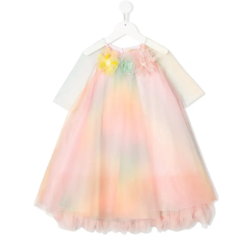 Платье из тюля с цветочной аппликацией от PAMILLA. Смещенный силуэт, тонально-градиентный эффект, круглый вырез, задняя застежка на пуговице, короткие рукава и короткая длина. Цвет: оранжевый.