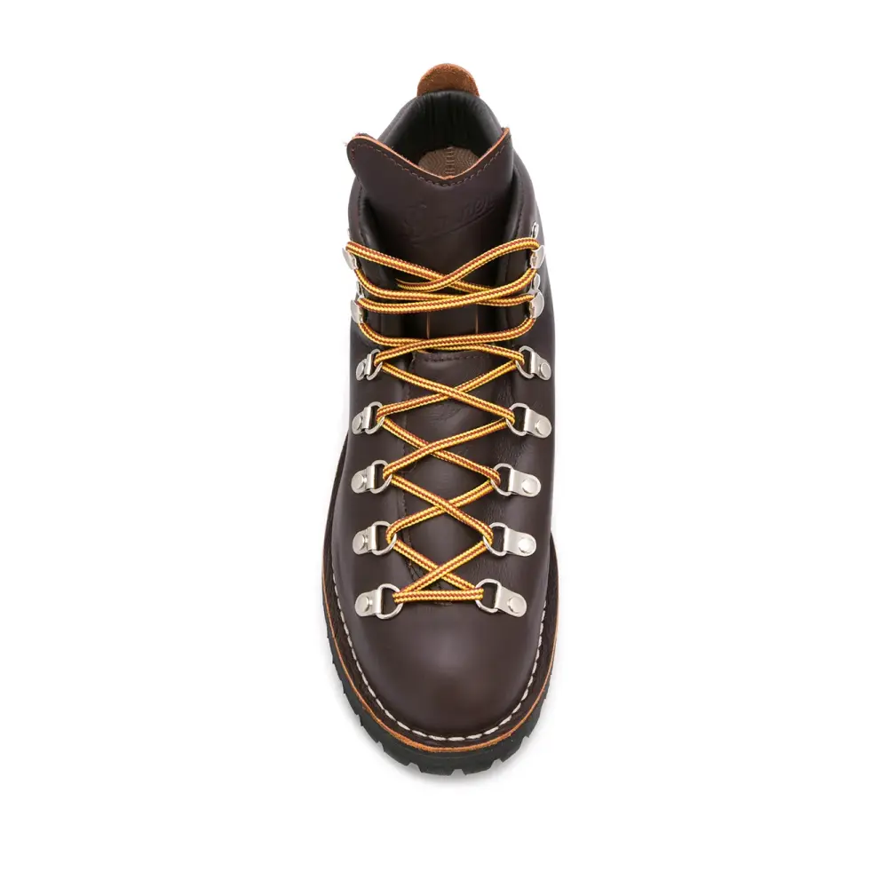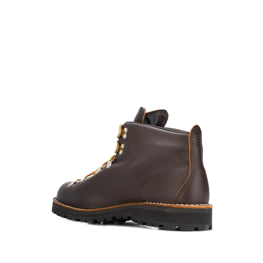 Ботинки Mountain Light от Danner. Застежка на крючок, большой язык, передняя шнуровка, ребристая подошва, тисненый логотип спереди и закругленный носок.