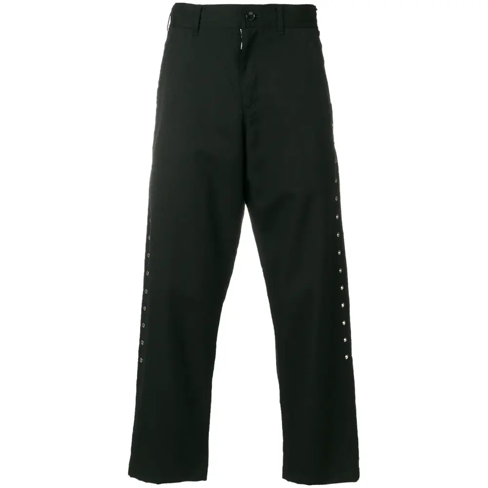 Черные шерстяные брюки чинос с заклепками от BLACK Comme des Garçons. Ширинка на молнии с пуговицей, петли для ремня, задние карманы, микро заклепки.