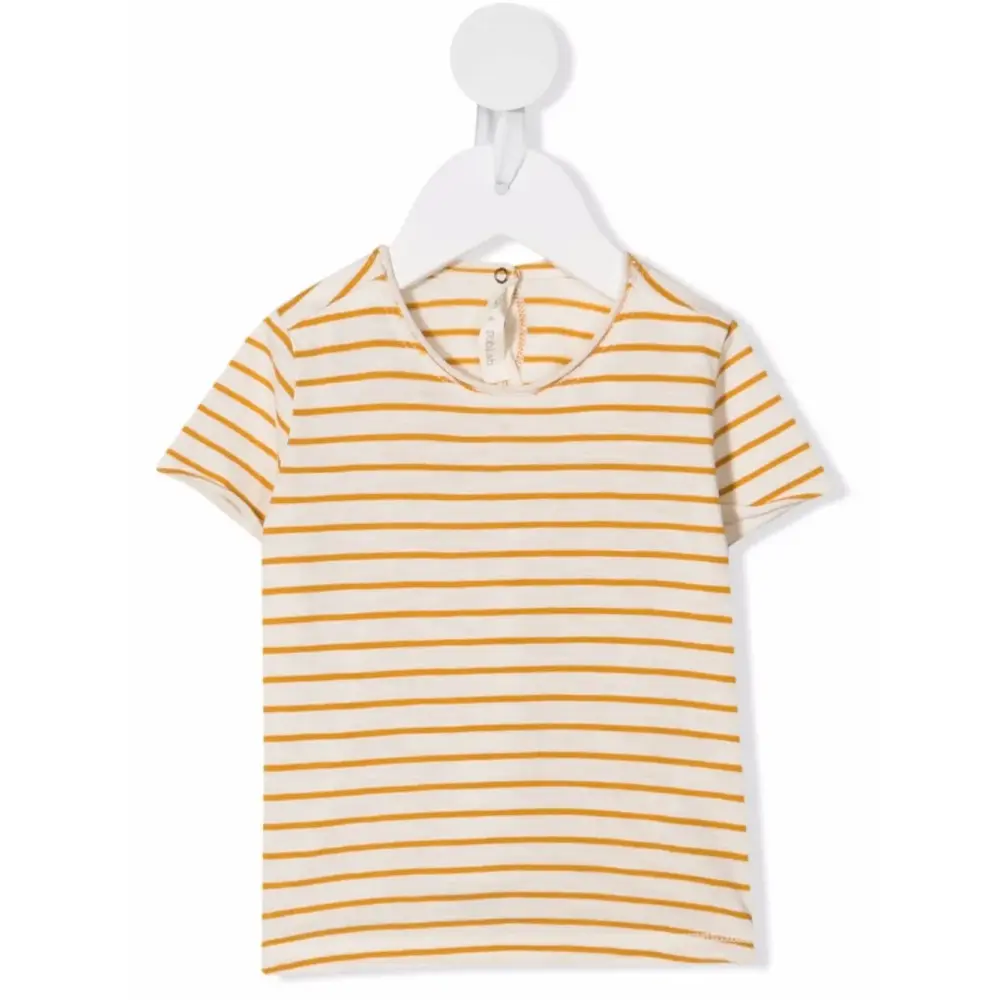 Узор в горизонтальную полоску, круглый вырез, застежка на пуговицы сзади, короткие рукава и прямой подол.