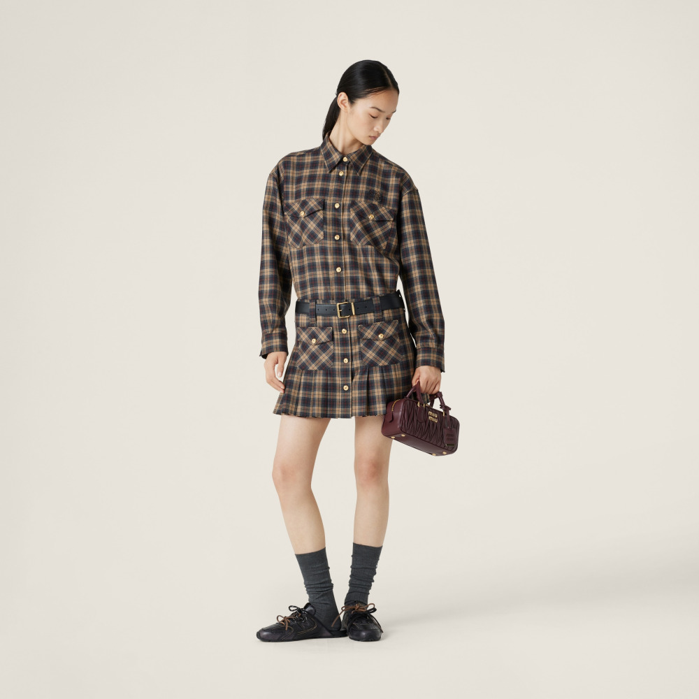 Классический тартан приобретает современное звучание в этой плиссированной шерстяной мини-юбке. Передние карманы и застёжка на пуговицы подчёркивают дерзкий и утончённый стиль Miu Miu.