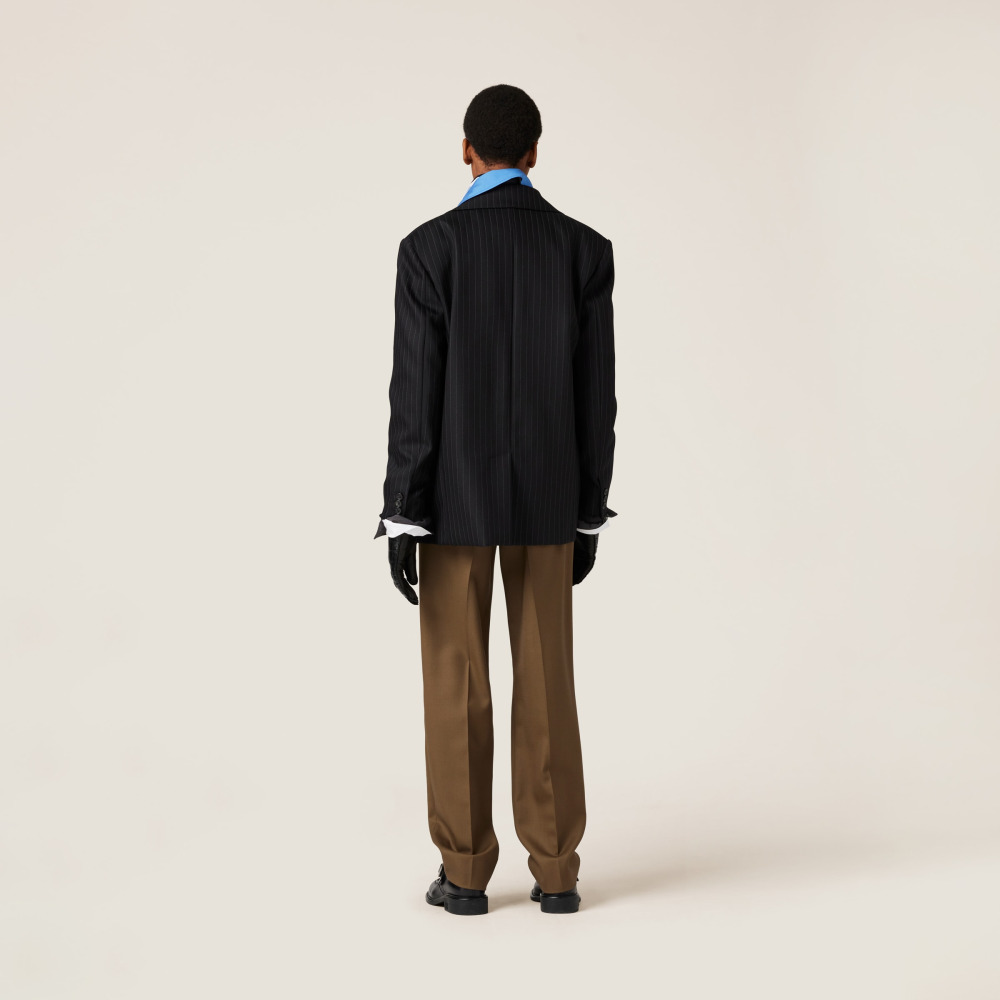 Мотив в тонкую полоску определяет строгий характер этого однобортного пиджака, а прямой крой и вышитый логотип придают смелости и стиля этой интерпретации классической мужской модели.
