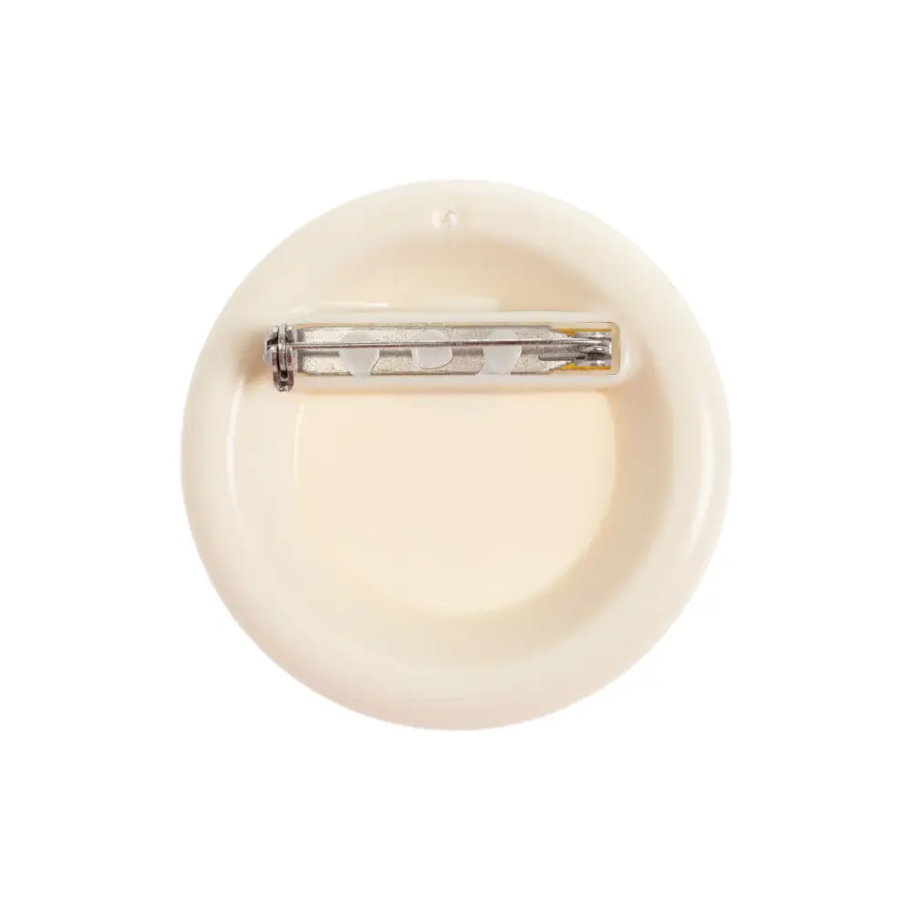 Светло-бежевый значок круглой формы с куполообразным украшением, тисненой надписью и застежкой-булавкой