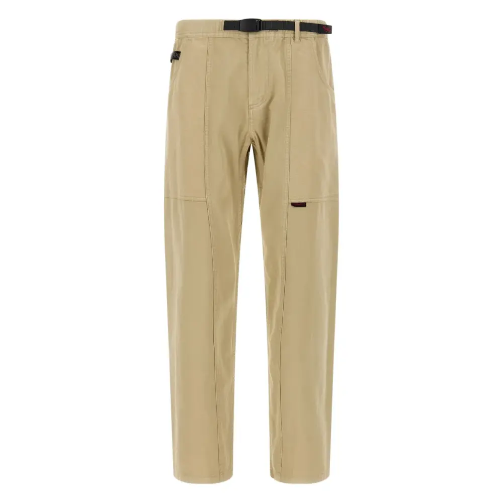 бежевый саржевый материал, эластичный пояс, встроенная утяжка, несколько карманов, застежка-молния и пуговица спереди