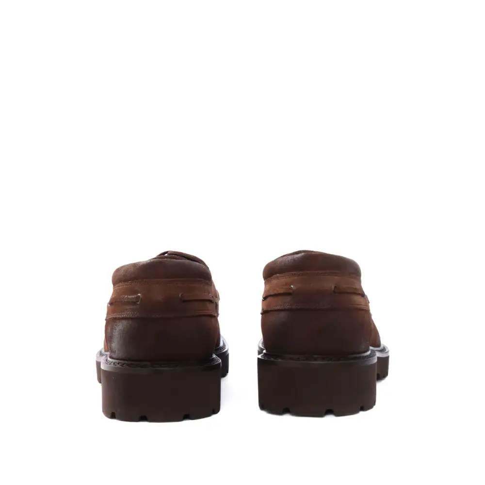 коричневые мокасины из замшевой кожи на шнуровке с простроченным мыском, резиновой массивной подошвой