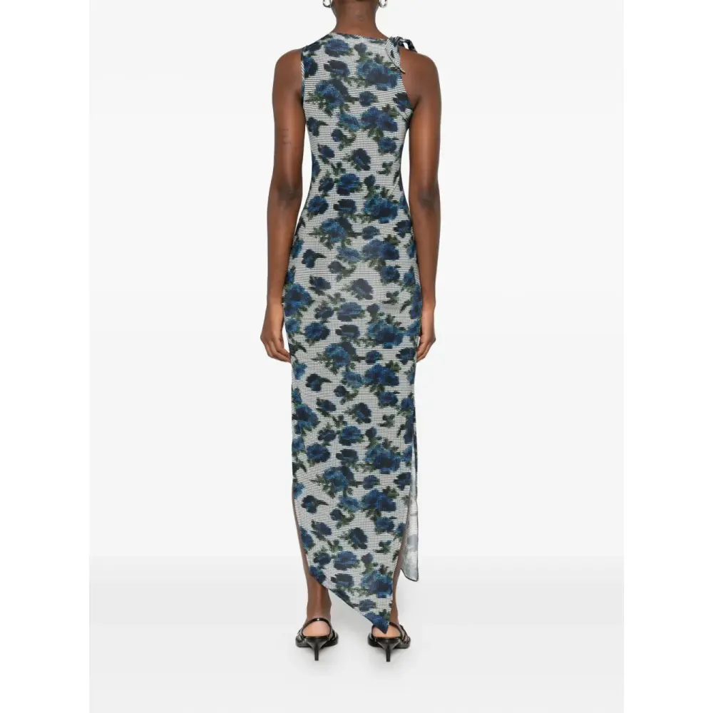 синее платье с цветочным принтом, драпированным вырезом, асимметричным подолом, разрезом сбоку и украшением в виде роз