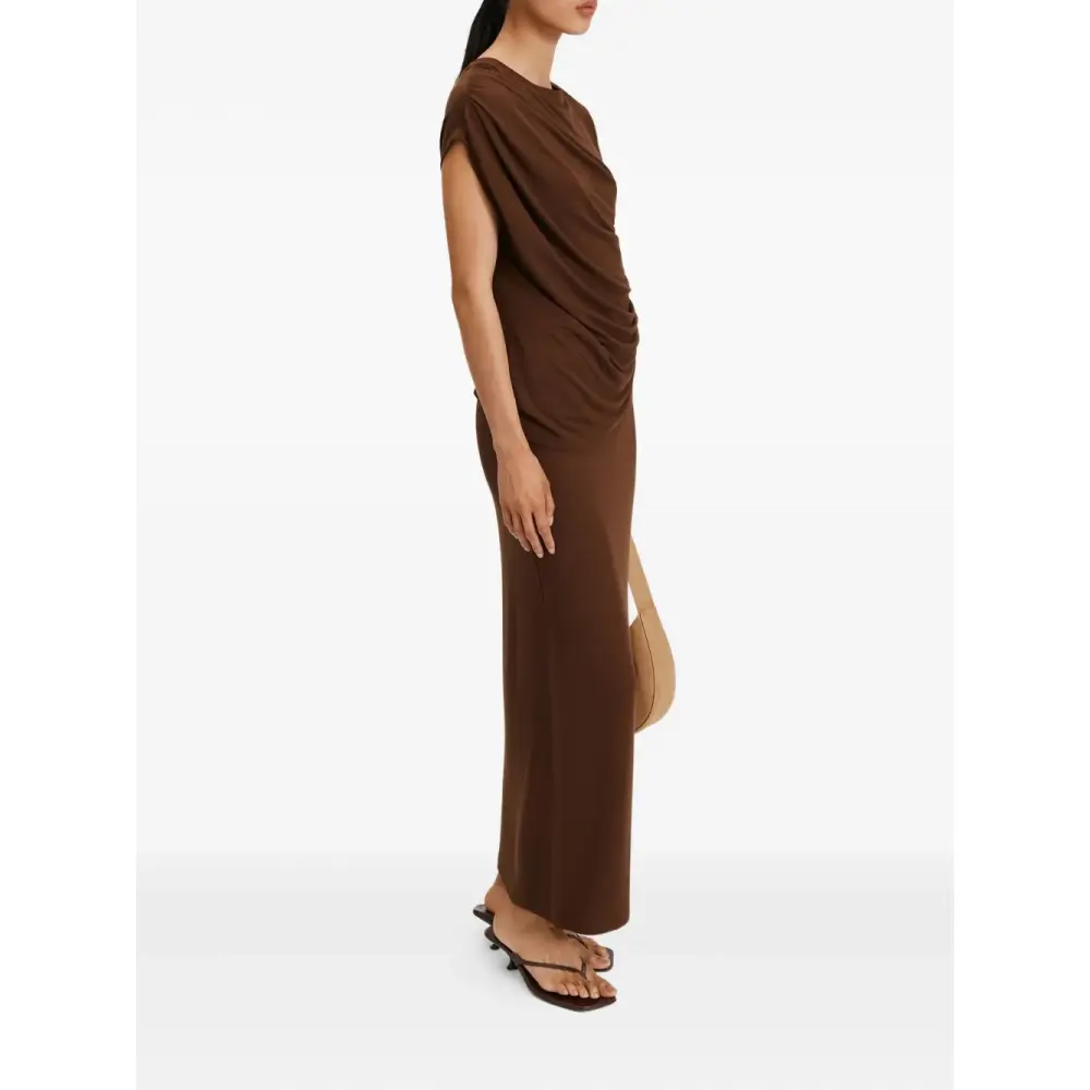 коричневое платье со драпировкой, короткими рукавами, круглым вырезом и присборенной талией