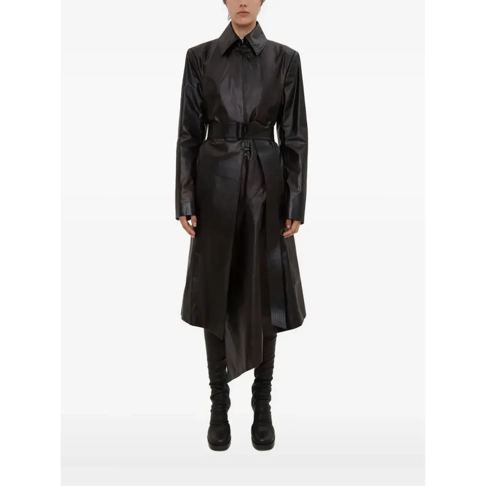 Кожаное пальто с поясом и заострённым воротником