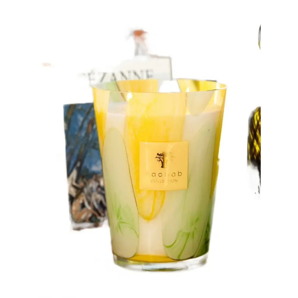 контейнер из стекла с мраморным узором жёлто-зелёного цвета, несколькими фитилями и принтом с логотипом. Пожалуйста, ознакомьтесь с разделом "Размер и посадка", чтобы узнать больше о размерах этого изделия.