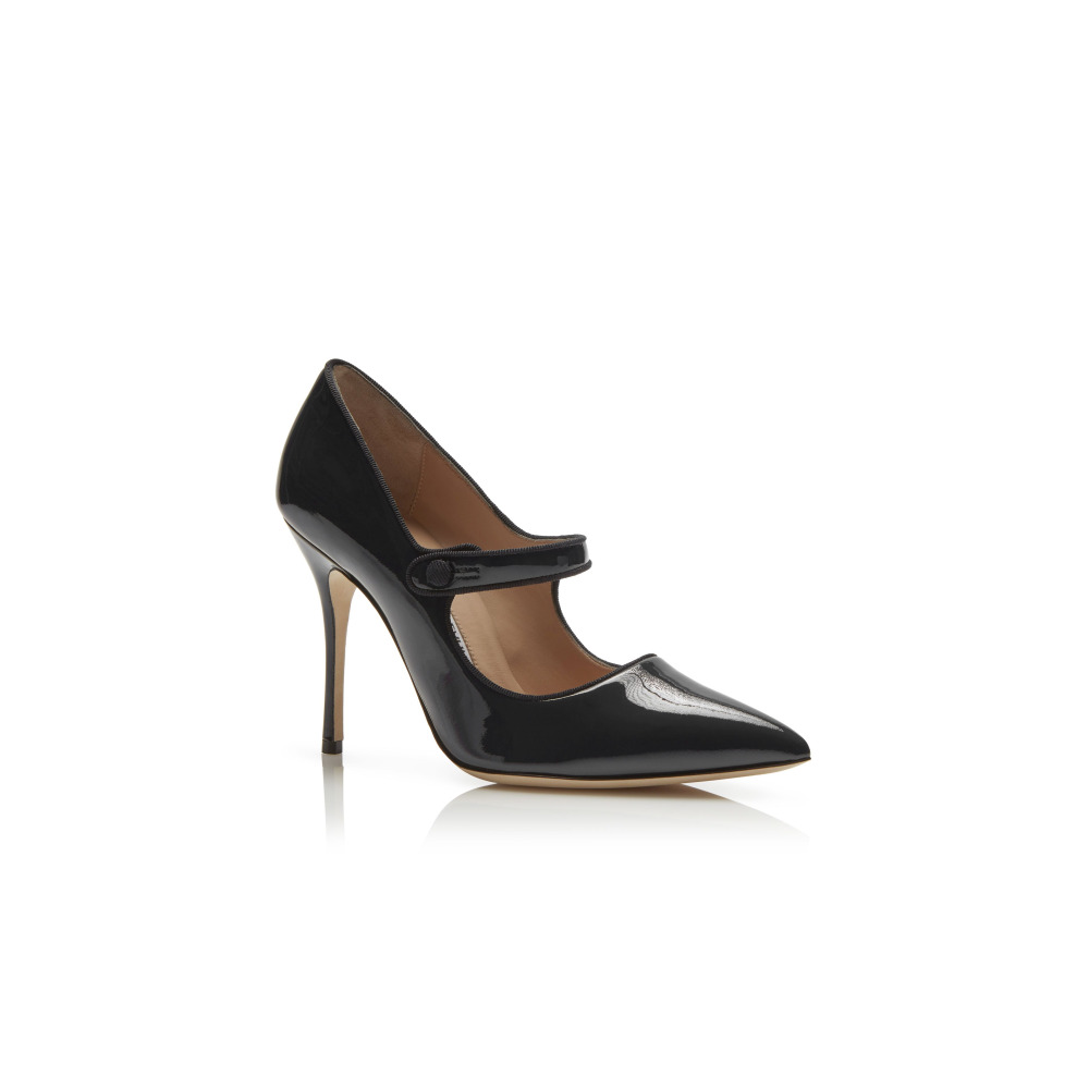 Туфли-лодочки из черного лакированного кожаного материала с заостренным мысом, отделкой из репсовой ленты, передним ремешком с застежкой на пуговицу и высоким каблуком-шпилькой.