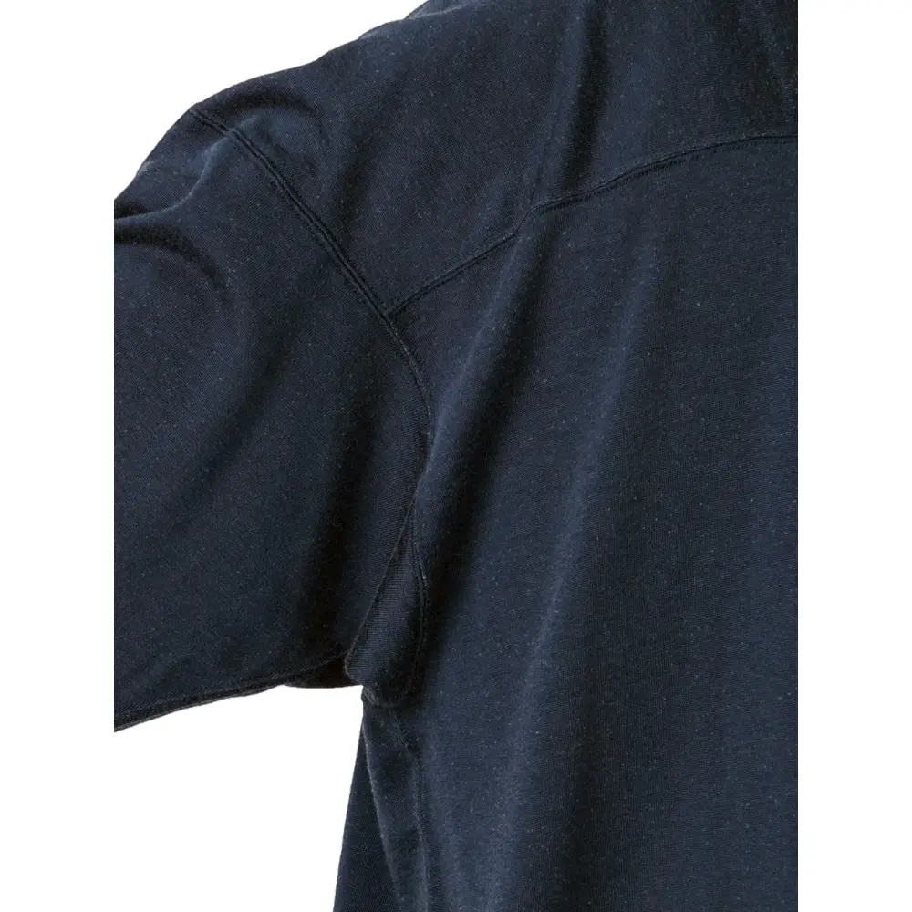 темно-синий свитер с круглым вырезом, длинными рукавами, однотонной прострочкой и прямым подолом