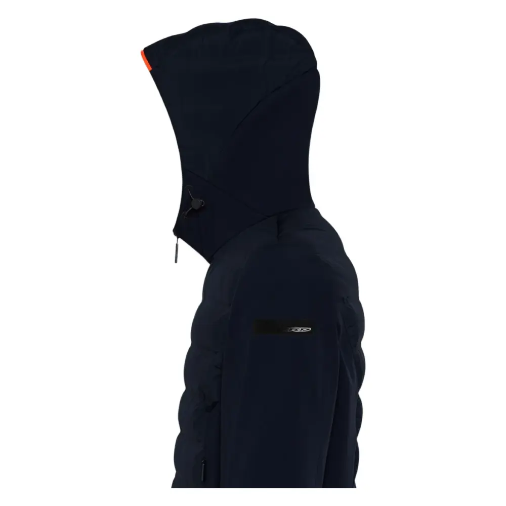 темно-синий худи на молнии с карманами по бокам, нашивкой с логотипом и стегаными вставками