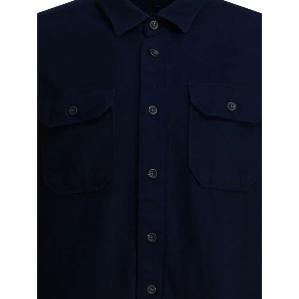 голубая рубашка с застёгивающимися на пуговицы длинными рукавами, нагрудными карманами и прямым подолом