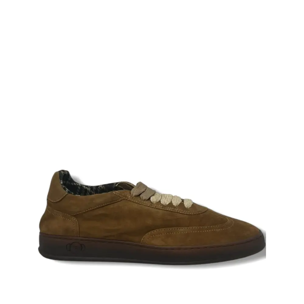 коричневая замша, текстурированная поверхность, круглый носок, шнуровка, резиновая подошва, логотип