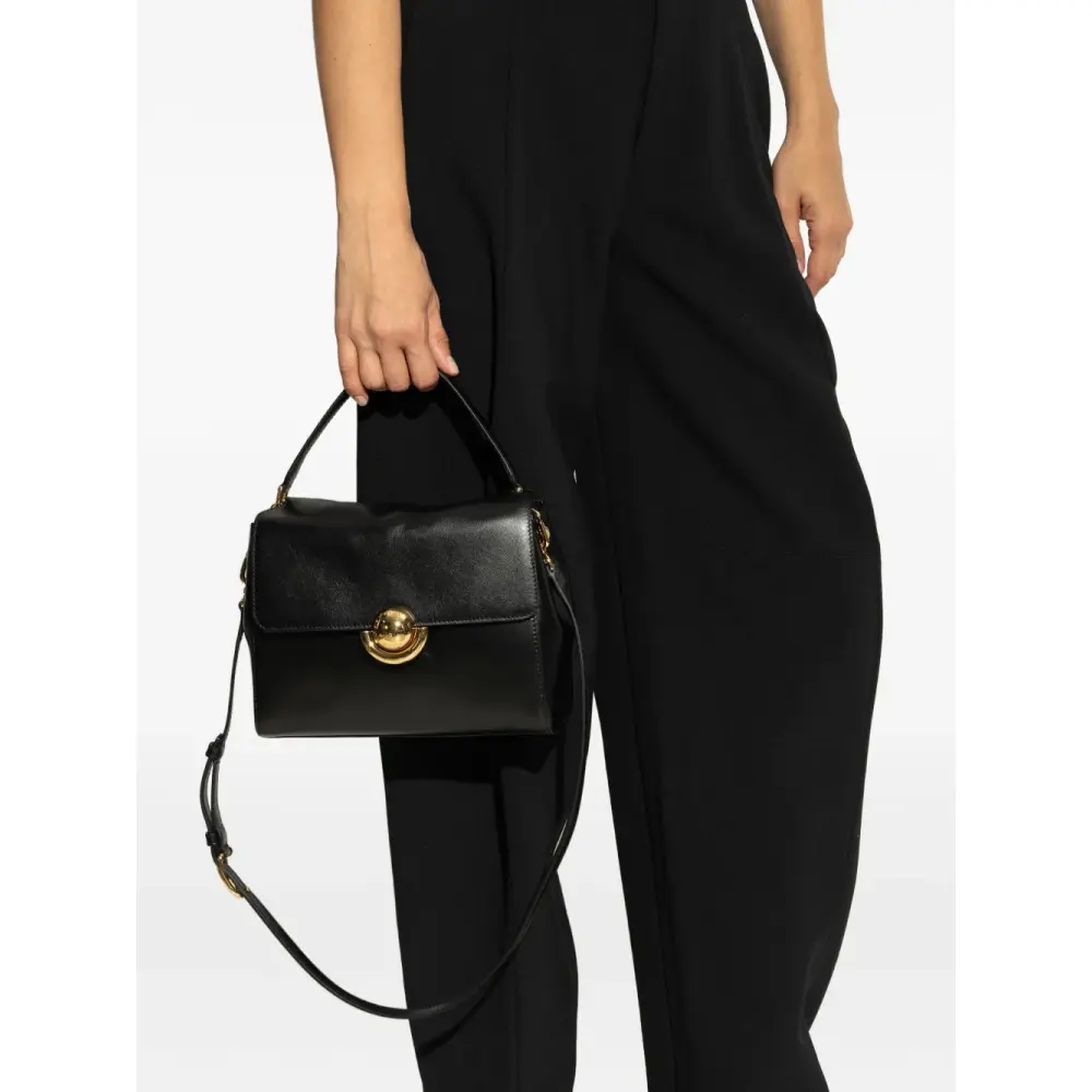черная сумка с верхней ручкой, фурнитура цвета золота, клапан-застёжка, регулируемый и съемный плечевой ремень