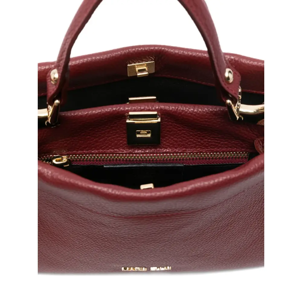 красная сумка с верхней ручкой, фурнитурой под золото, с логотипом, съемным плечевым ремнём и застёжкой-молнией