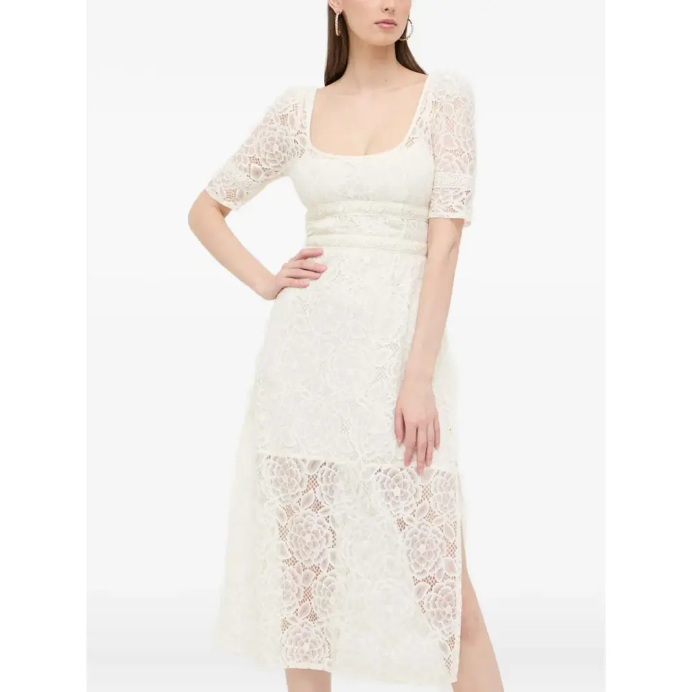 белое кружевное платье с открытой спиной, короткими рукавами, цветочными деталями и завязками на спине