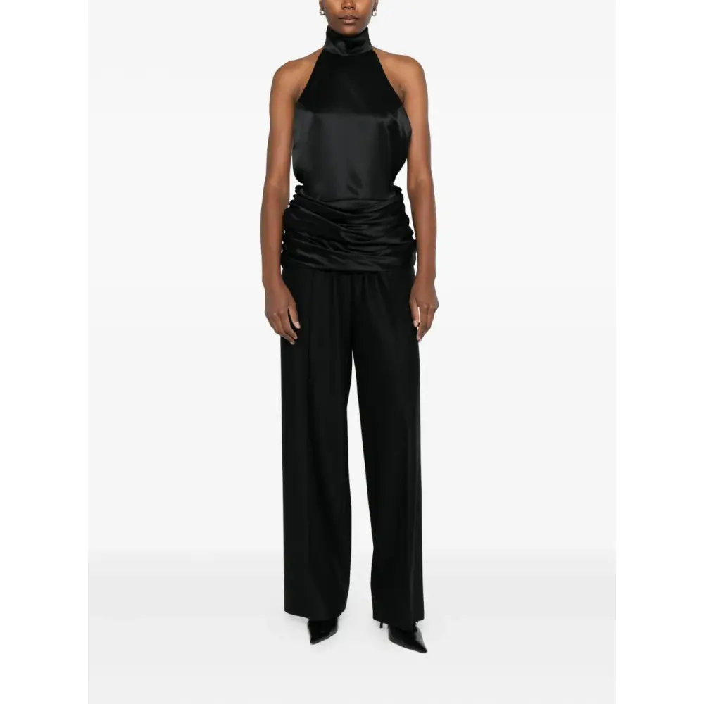 черный шелковый топ с воротником-хомутом, присборенными деталями, открытой спиной и без рукавов
